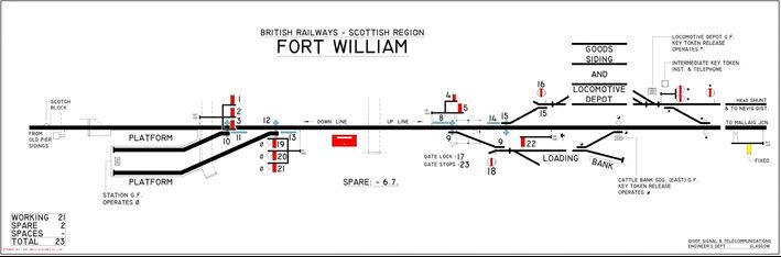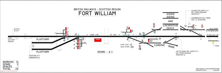 The above is a recreation of the diagram which used to hang in the old Fort William signal box. It shows the layout of track and signals controlled from the box, as it was in 1957. The numbers on the diagram correspond to lever numbers in the 23-lever Saxby & Farmer frame. The recreation was drawn by Robert Dey and may be downloaded as a pdf by clicking here or on the image.
