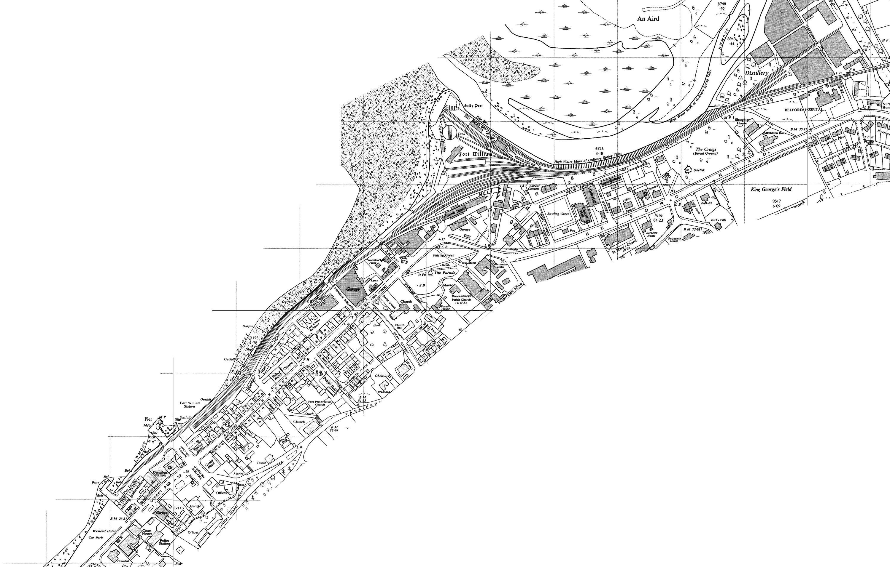 The extract above from the 1964 map shows how the layout had changed by that time. The remaining original buildings in the Old Fort have now been demolished and the larger 1948 turntable can be seen. The LNER Goods Depot is now well established on the south side of the line. Note also that one of the two sidings past the station to the New Pier had been removed.